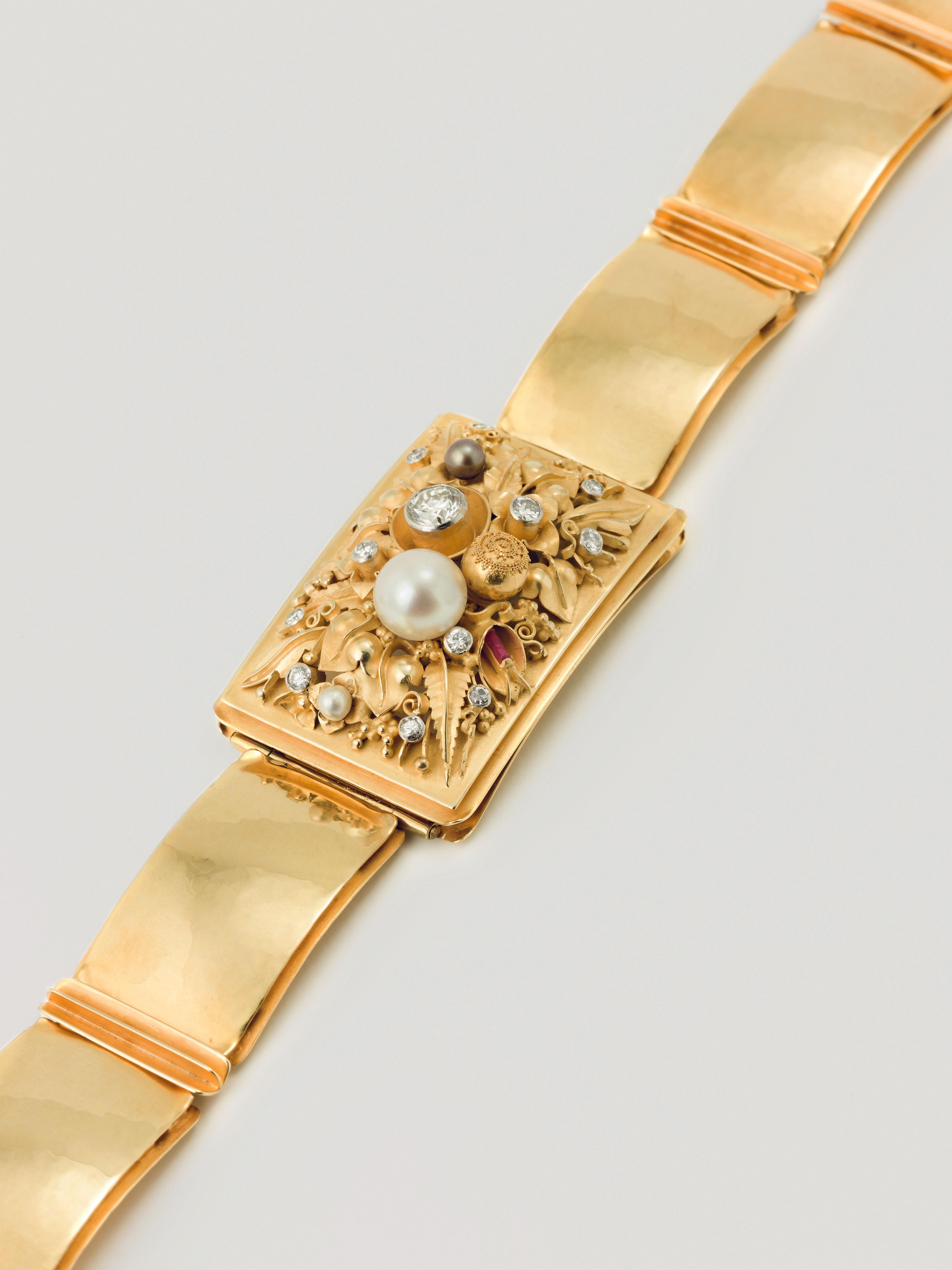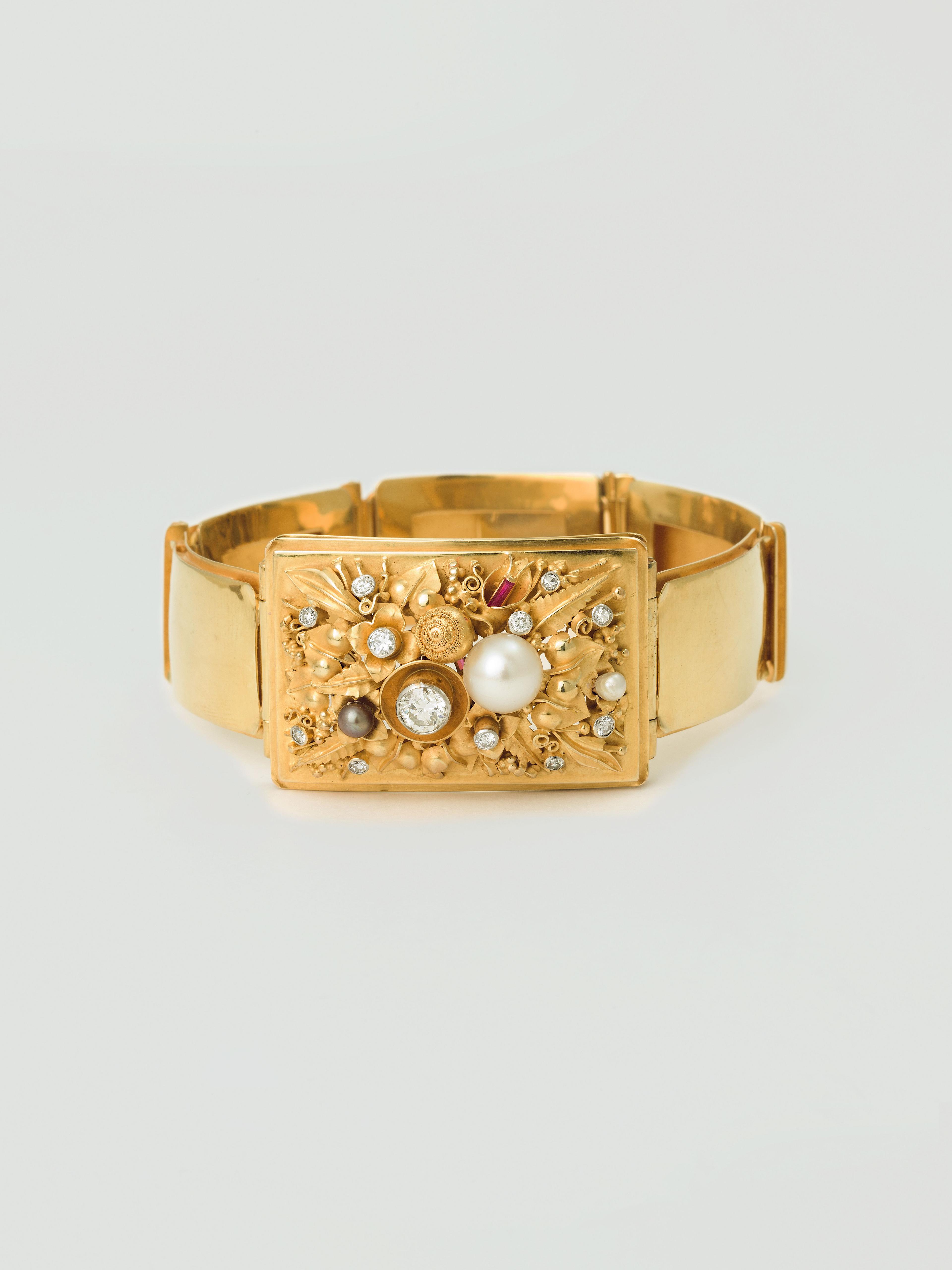 Gold, z.T. granuliert, Brillanten, Perlen
