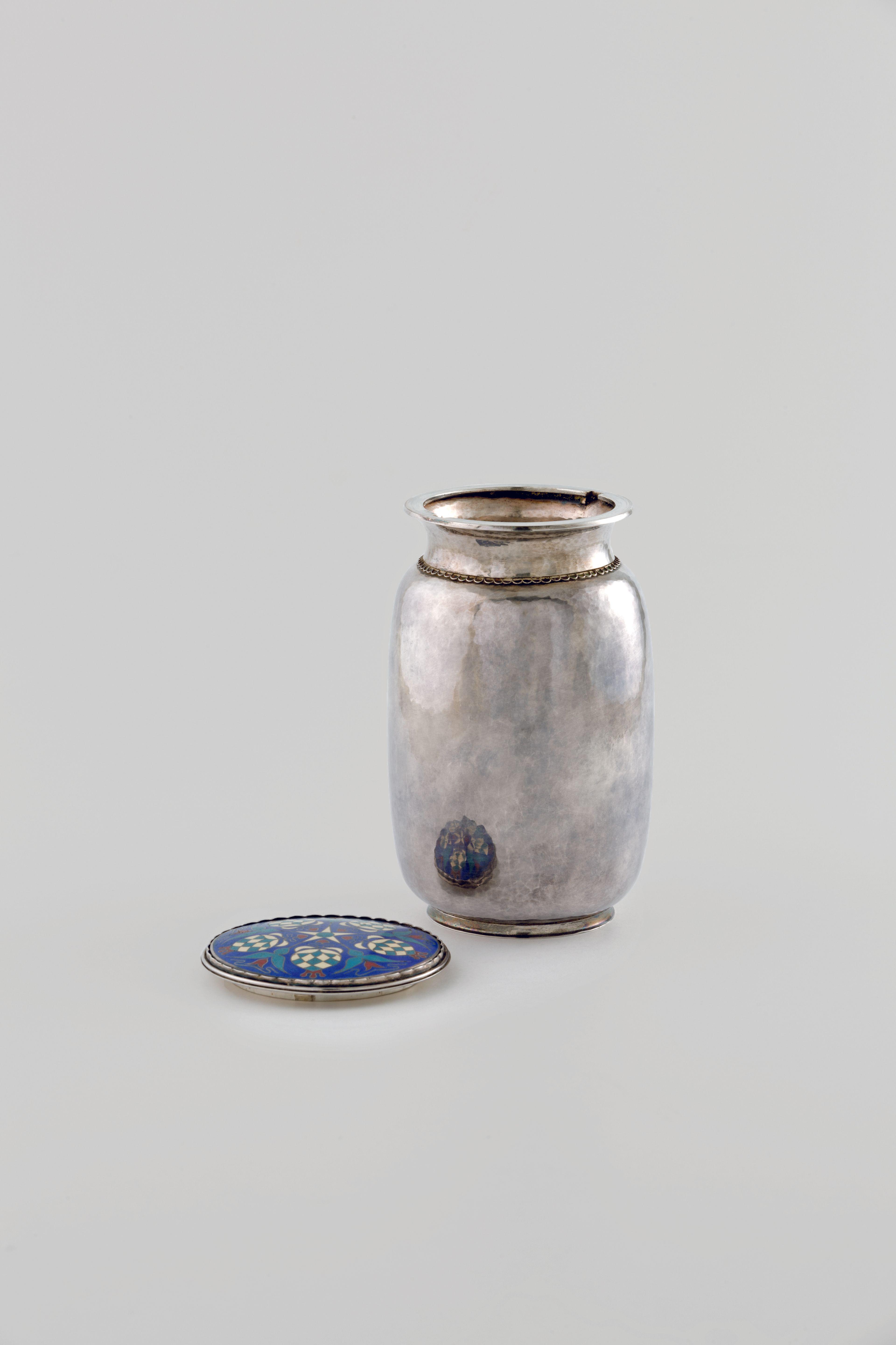 Silber, handgetrieben, Emaille (Deckel) blau, weiß, rot