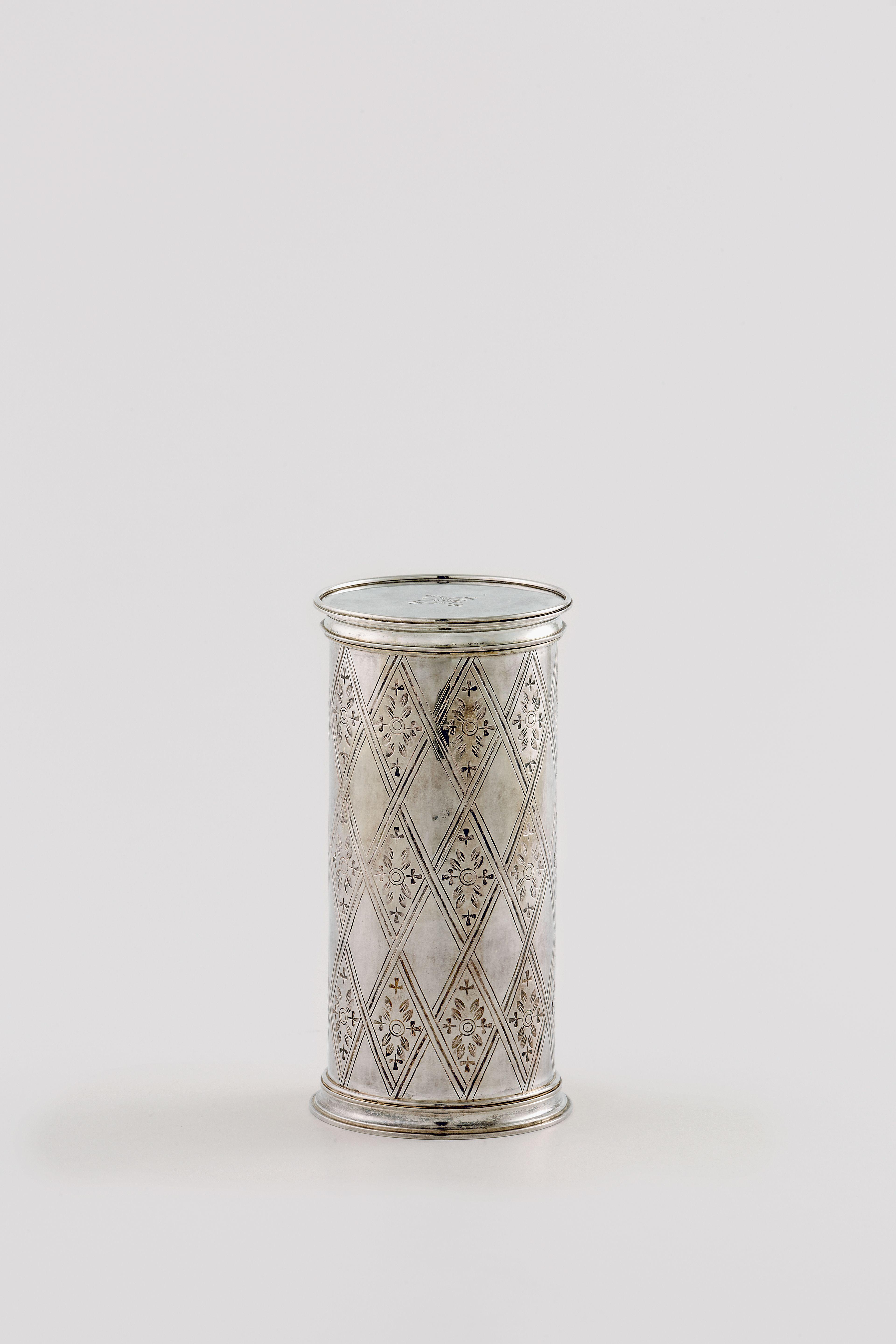 Silber, handgetrieben, Emaille (Deckel) blau, weiß, rot