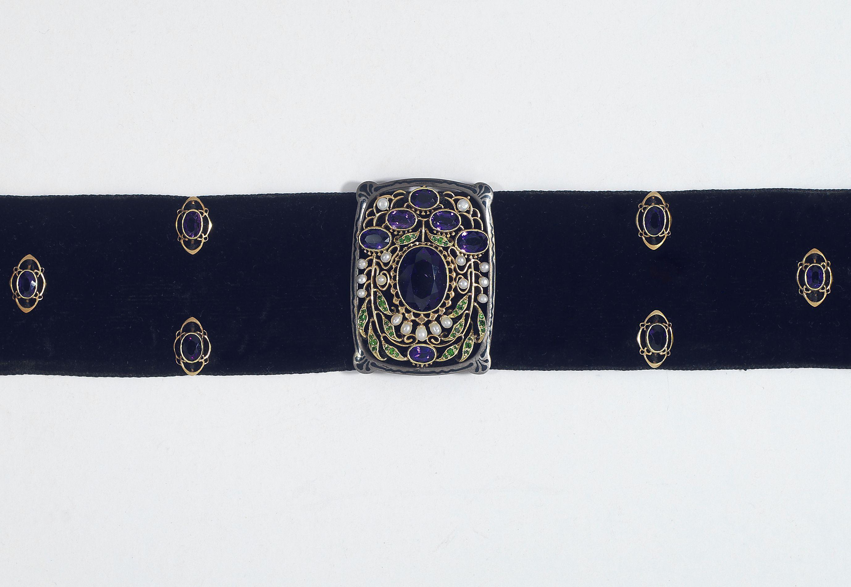 Gold, Silber, Amethyste, Olivine, Perlen, Samt