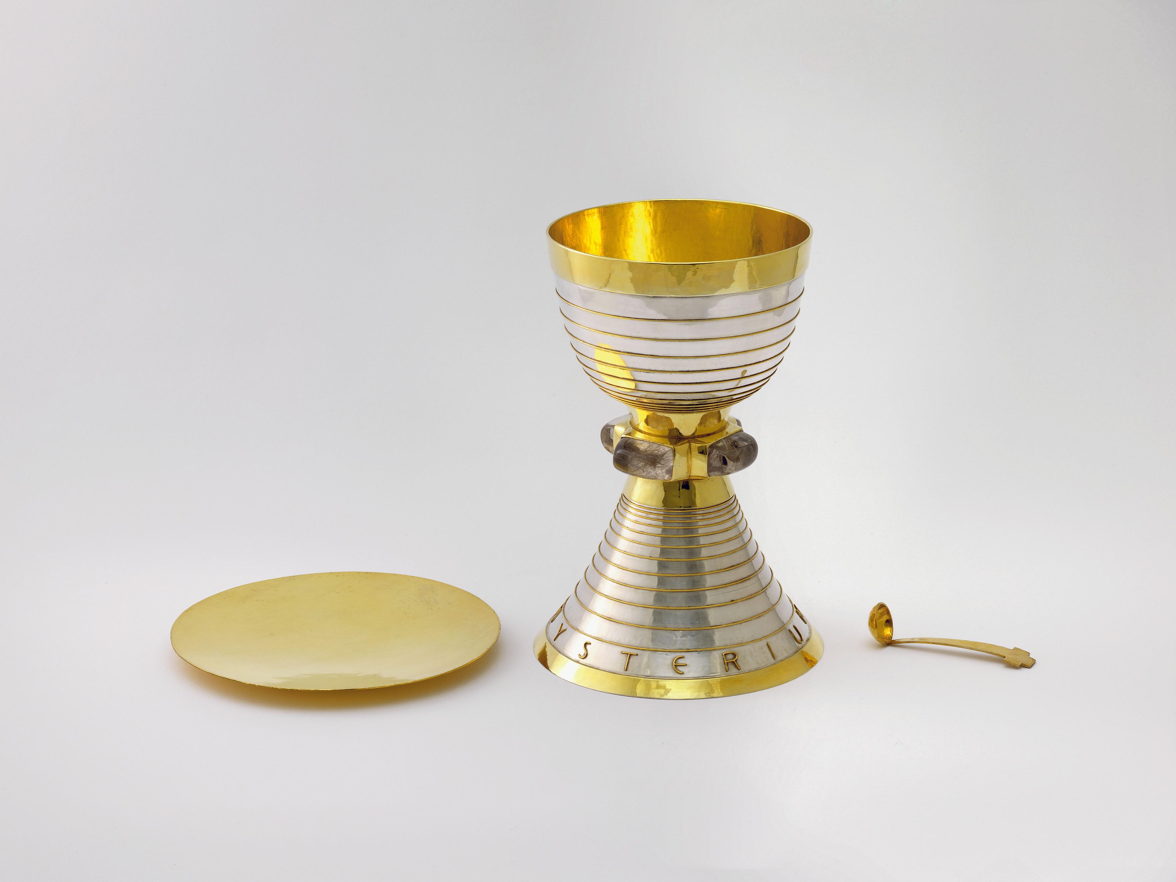 Kelch: Silber, handgetrieben, teilweise vergoldet, Bergkristalle / Patene: Silber, vergoldet / Löffel: Silber, vergoldet