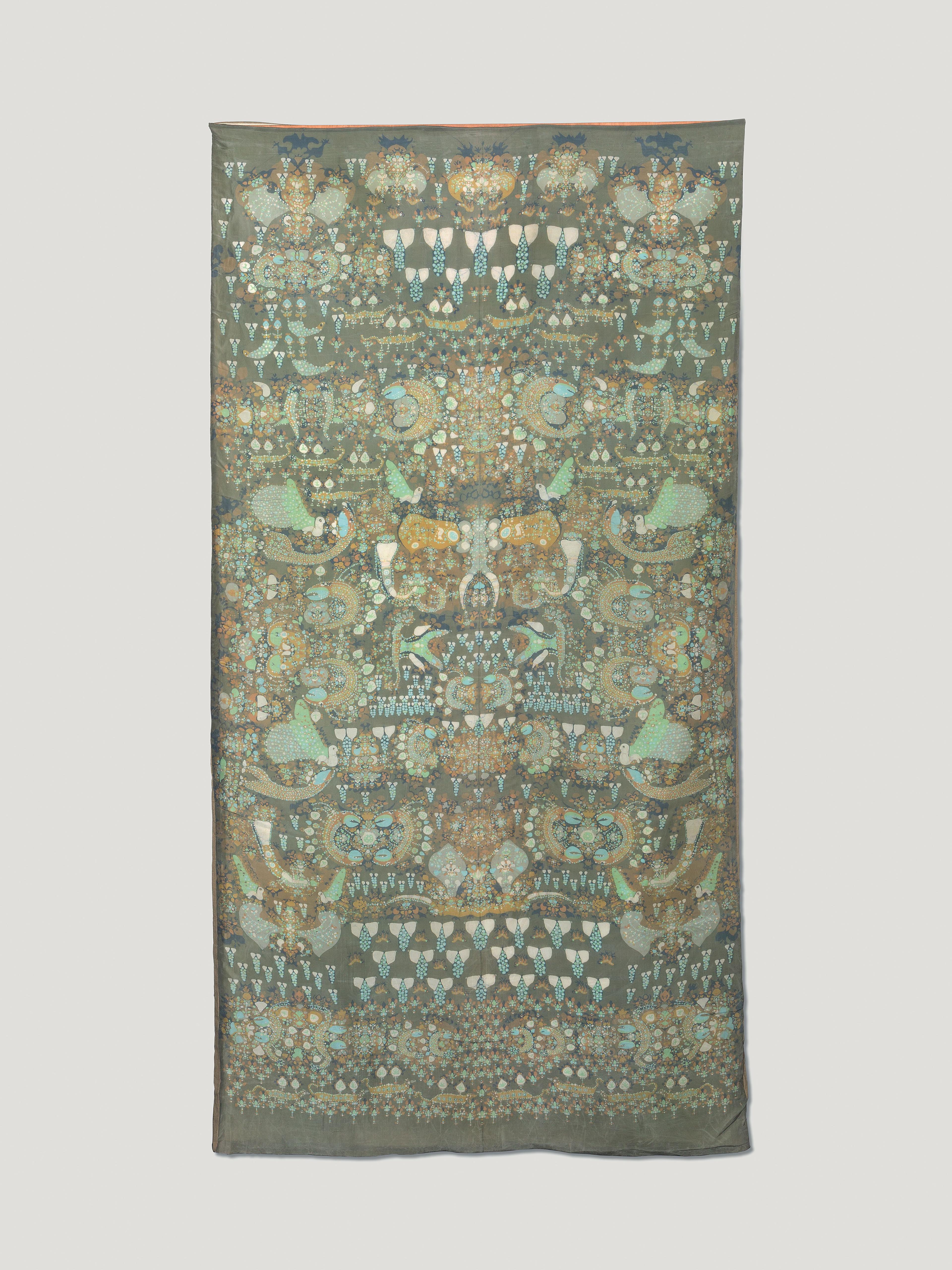 Tjanting-Batik auf Seide, Seitenteile Leinwand (nach hinten umgelegt)