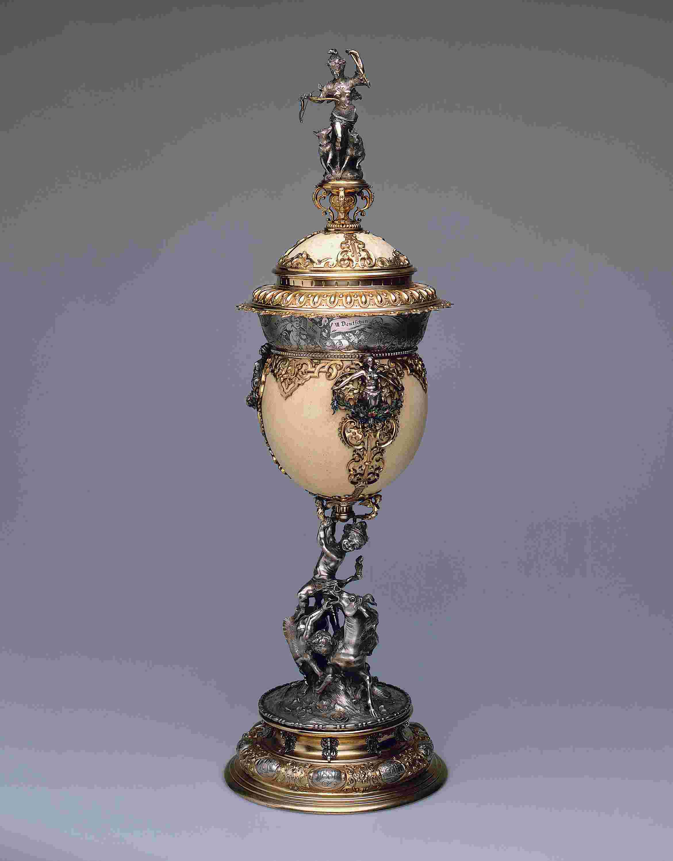 Silber, getrieben, gegossen, graviert, ziseliert, punziert, teilvergoldet, Straußenei, Transparentemaille